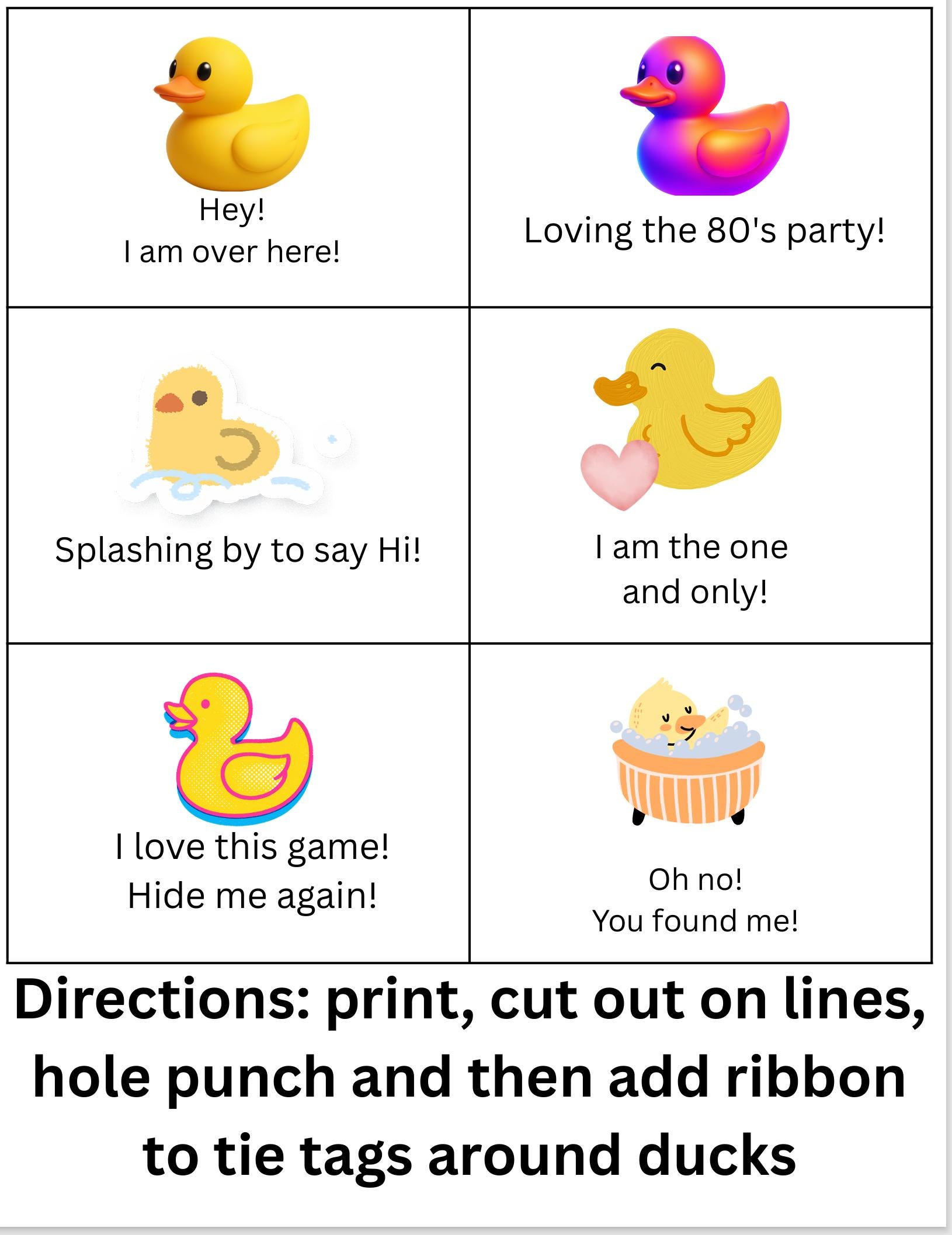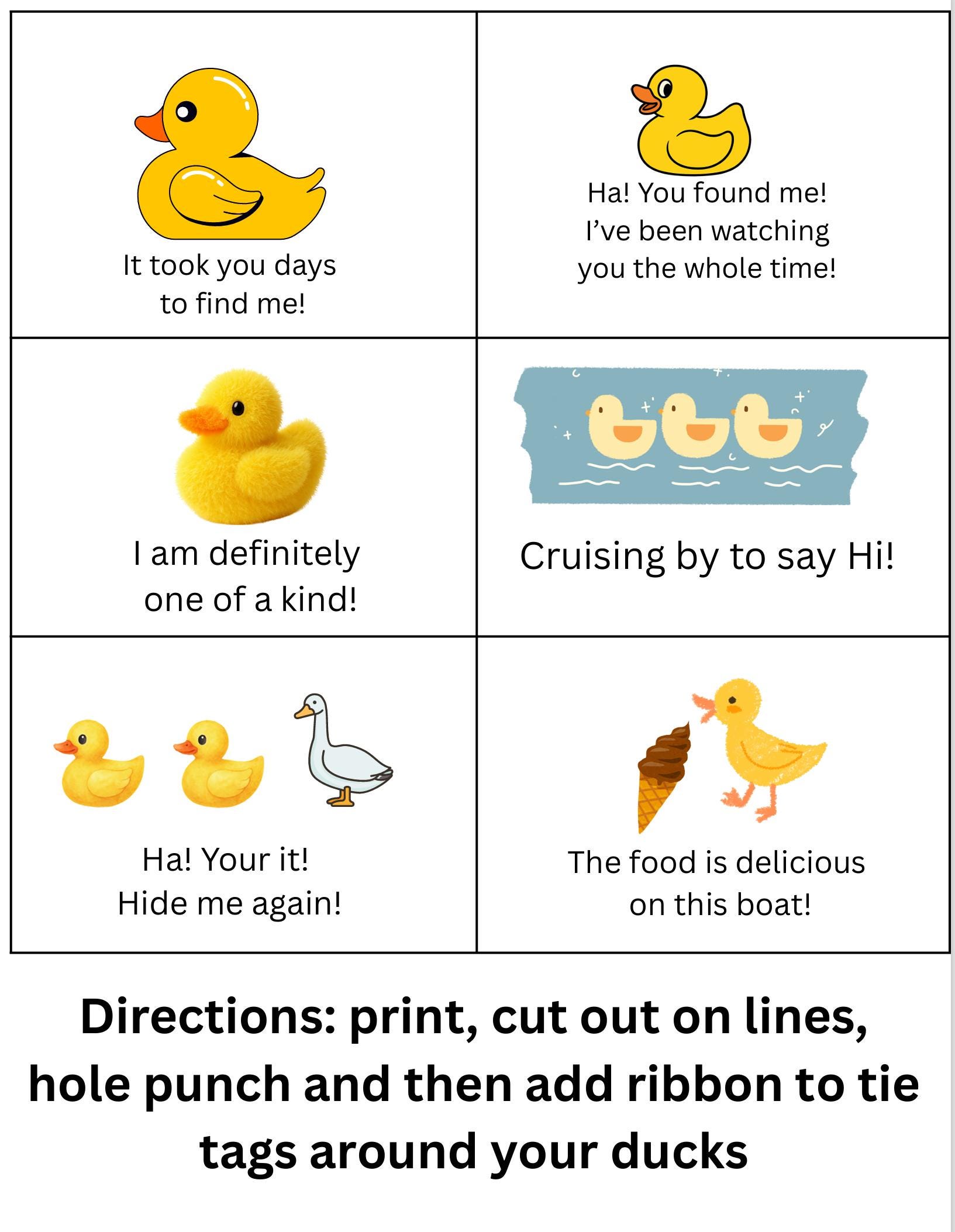 Directions: download, print, cut out, hole punch and add ribbon to tie them around your ducks.