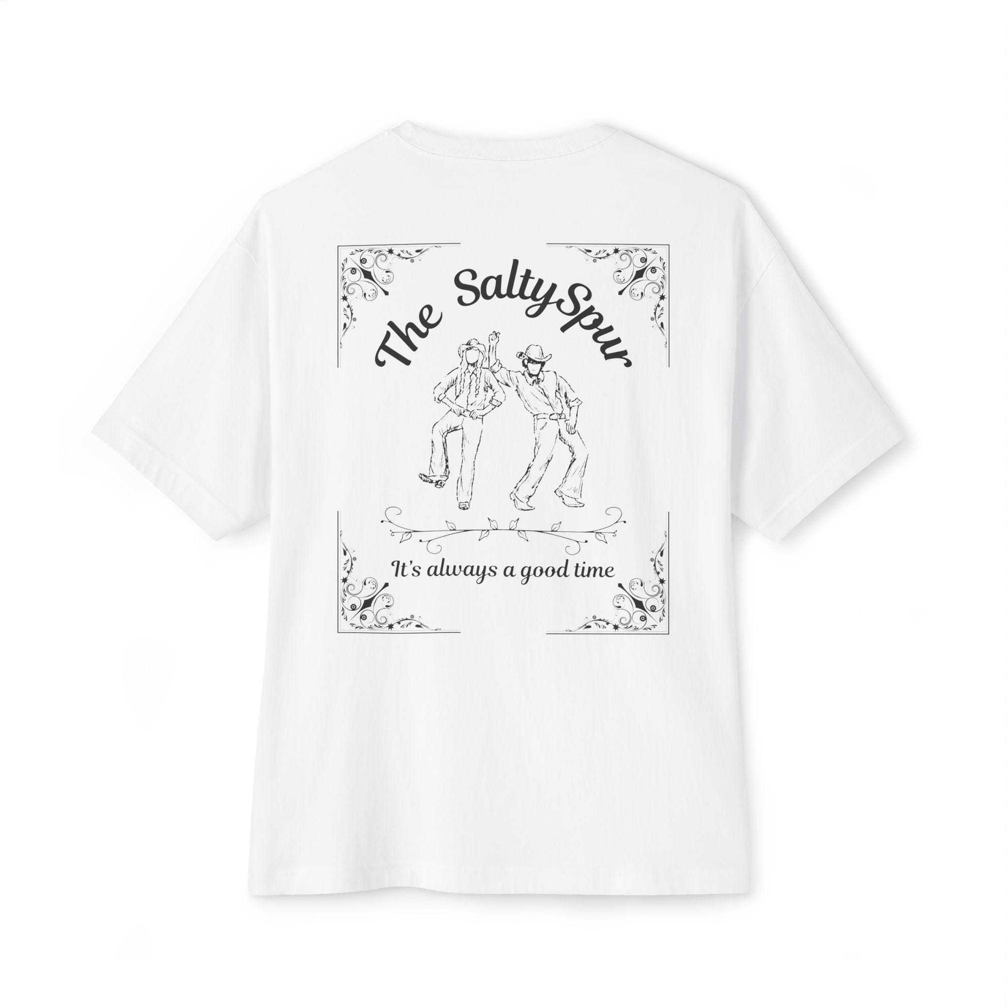 Light, lived-in, and effortlessly cool — this oversized boxy tee feels like the shirt you reach for when you want to slow down and savor the day. The front carries a small sunset wave emblem, a quiet nod to evenings on the sand. The back opens up with a vintage-inspired frame and an illustration of two friends mid-toast beneath the script "The Salty Spur," followed by the line, "It’s always a good time." Wear it to shore walks, low-key backyard hangs, or road trips that end at a beachside diner. The relaxed drop-shoulder silhouette drapes casually, sleeves hitting mid-arm and a roomy body that lets air move freely. It’s breathable, soft against sun-warmed skin, and meant to be worn where salt, laughter, and slow hours meet.