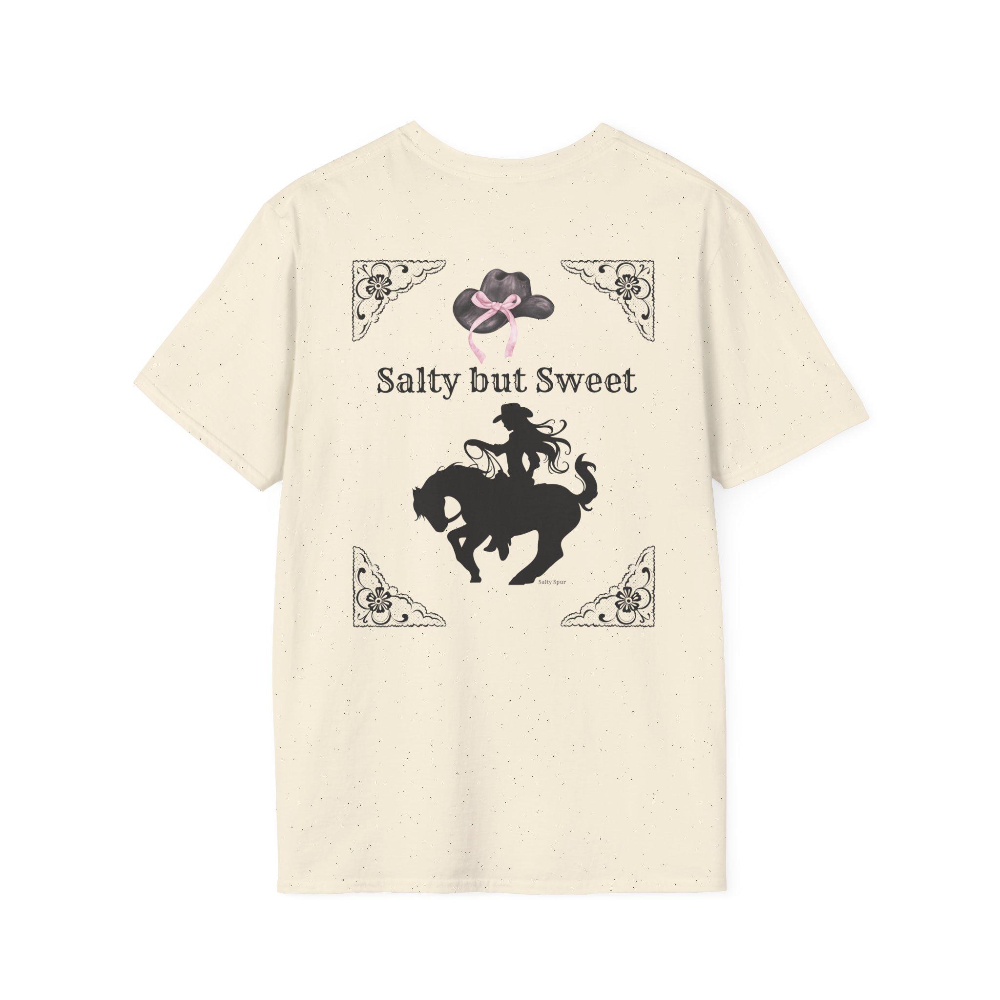 A soft, everyday tee that pairs sunlit surf vibes with a little country edge. The lightweight, ring-spun cotton feels gentle against skin while a small sunset-wave badge sits over the heart and a larger, vintage-inspired rodeo silhouette fills the back with the phrase “Salty but Sweet.” It reads like someone who spends mornings on the sand and evenings at the barn—laid-back, a touch playful, quietly confident. Wear it to slow dawn walks, bonfire nights, weekend rodeos, or whenever you want a shirt that hints at both ocean salt and prairie dust.