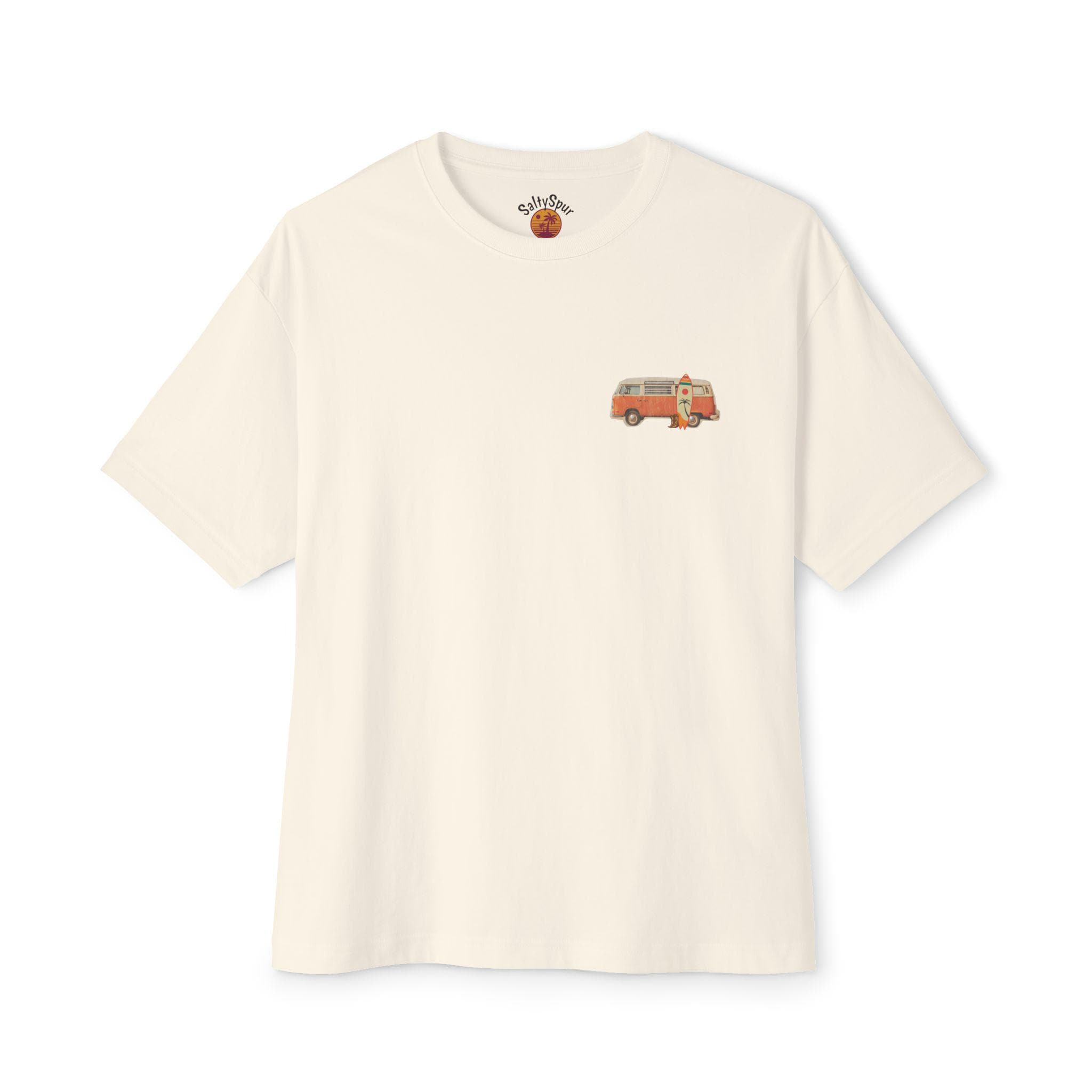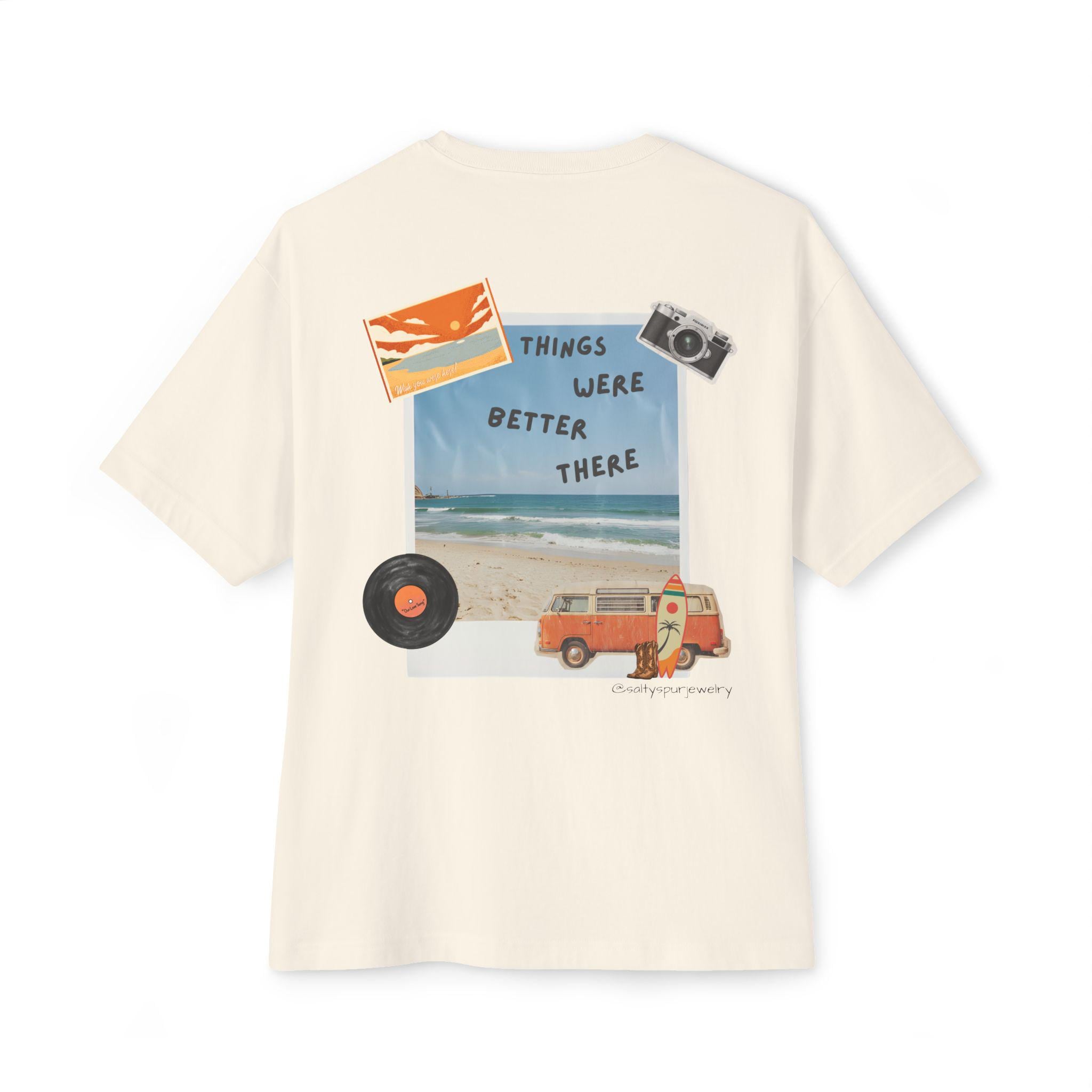 This relaxed boxy tee brings a slow-summer, road-trip mood to everyday wear. A small sunset wave emblem sits over the heart, while the back shows a sunlit beach snapshot framed with vintage stickers — a van, vinyl record and camera — with the handwritten line “things were better there.” Soft, mid-weight cotton and a dropped shoulder create a laid-back silhouette that layers easily or stands on its own. Wear it for long drives, bonfire evenings, or quiet mornings by the shore; it feels like the memory of a perfect day lived twice.
